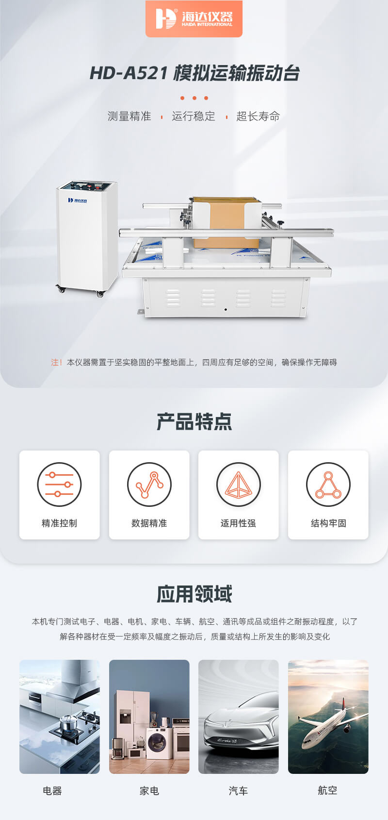 海達(dá)儀器HD-A521 模擬運(yùn)輸振動(dòng)臺(tái)是專業(yè)用于模擬汽車運(yùn)輸途中的顛簸對(duì)產(chǎn)品造成的破壞,用以鑒定產(chǎn)品是否忍受環(huán)境振動(dòng)的能力測(cè)試。
